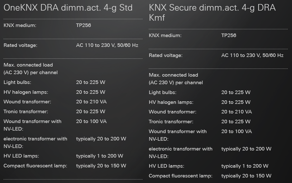 Bộ truyền động điều chỉnh độ sáng KNX 4 băng nhóm có sẵn trong các biến thể Tiêu chuẩn và Komfort. Biến thể Tiêu chuẩn có các chức năng được yêu cầu thường xuyên nhất, trong khi biến thể Komfort cung cấp các chức năng hữu ích bổ sung.